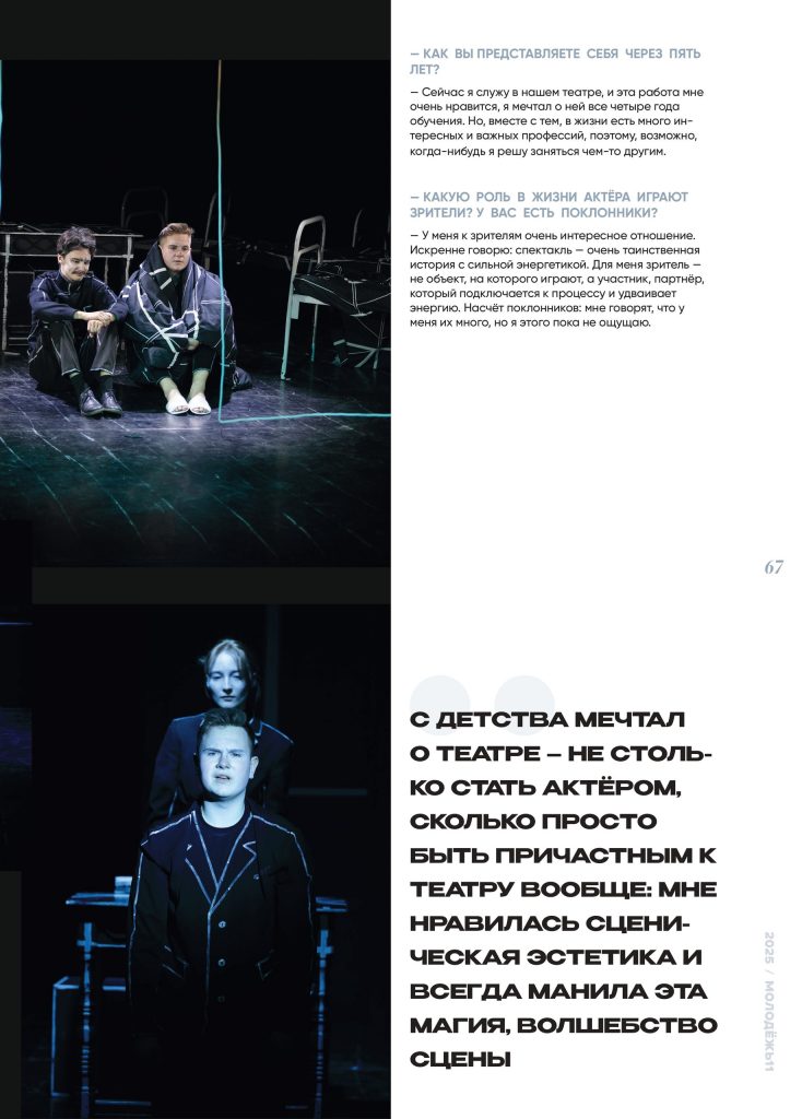 На страницах журнала опубликовано интервью с Артёмом Лазаревым, в котором он рассказал о своём творческом пути, работе в театре и выборе профессии актёра.